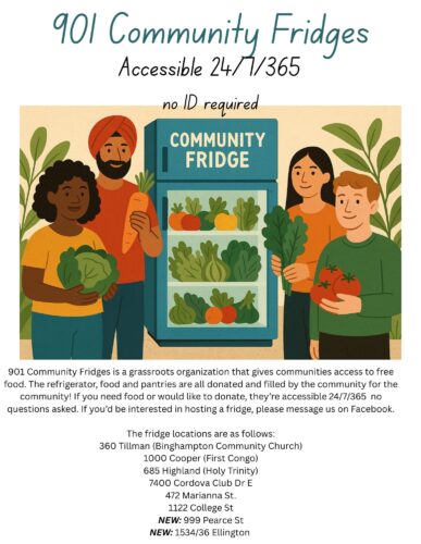 Binghampton Community Church 901 Community Fridges Return to Directory Listing Category Food and Meals Description 901 Community Fridges Primary Address 360 Tillman St ZIP Code 38112 Website URL https://www.facebook.com/901communityfridges/ Operating Hours First Come First Serve Listing Tags Friday, Monday, Saturday, Sunday, Thursday, Tuesday, Wednesday Contact listing ownerSend Message Name Email Phone Number Message